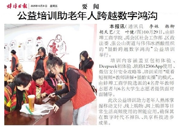 “校+政+企”模式公益培训,有效助力银龄朋友熟练掌握移动支付、线上购物、网上购票等日常生活高频使用的智能应用。通过培训,帮助他们克服对智能技术的恐惧与陌生感,享受数字化生活的便捷高效,确保其在数字时代不掉队、共享科技进步成果,进而推动社会向更包容、和谐、共融的方向发展。此次公益培训蚌埠日报进行了宣传报道。